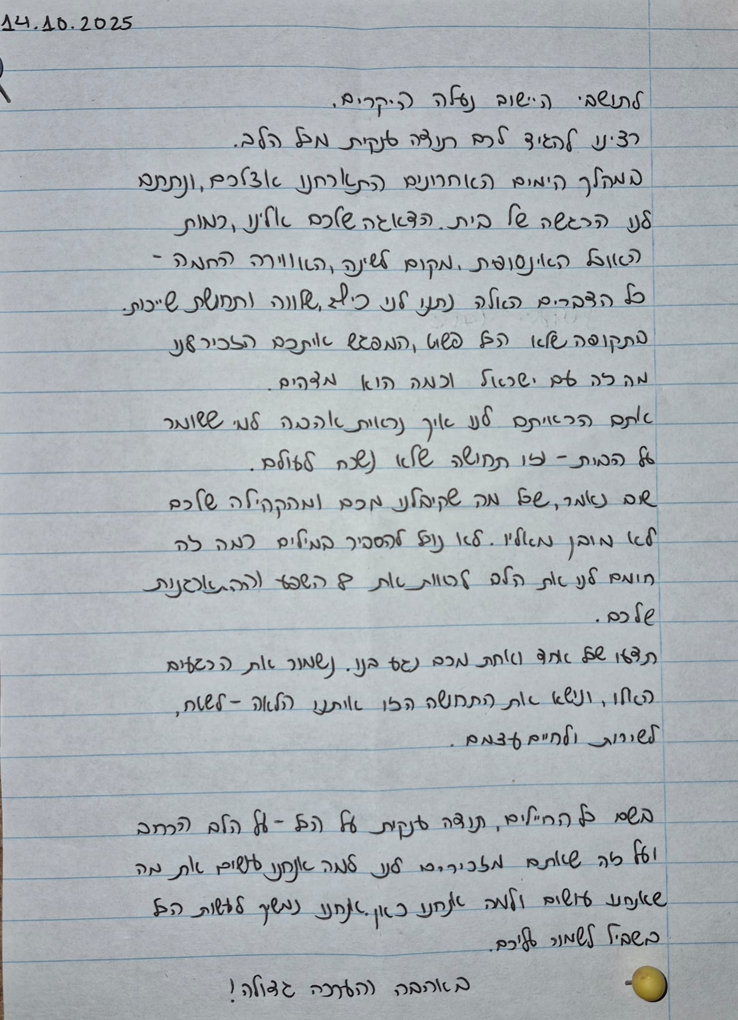 תושבים יקרים. החיילים שהתארחו בישוב בתקופת החג ותגברו את מערך הבטחון הישובי, מוסרים את הערכתם הרבה. מצורף מהם מכתב.אנו מודות לכל התושבים שנרתמו, תרמו, טרחו והשקיעו מכל הלב.תודה 💕