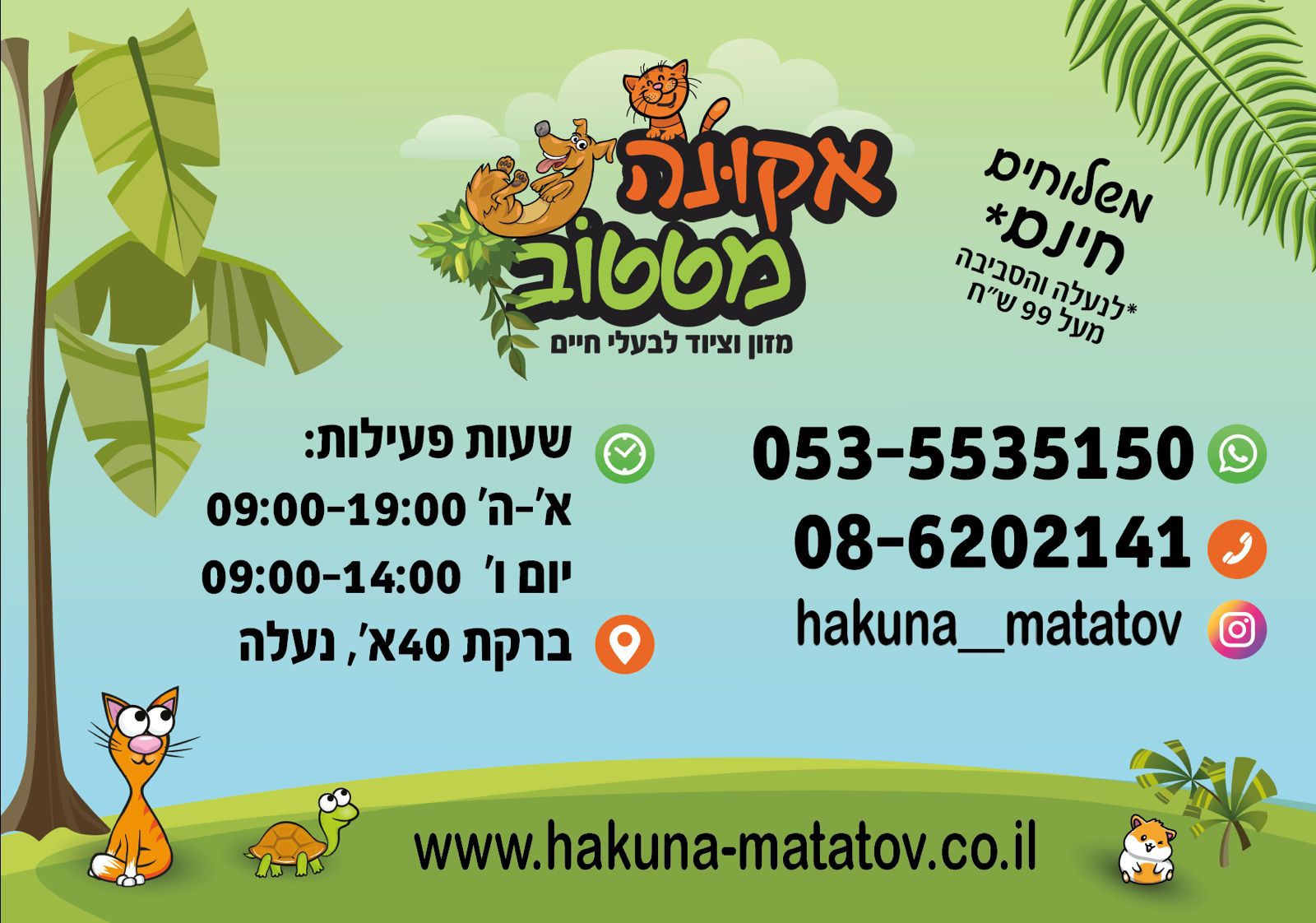 אקונה מטטוב-ציוד ומזון לבעלי חיים מבחר איכותי של מזון, ציוד ואביזרים לכל סוגי בעלי החיים. שירות אישי, ייעוץ מקצועי ומבצעים שווים! כתובת: ברקת 40A, נעלה שעות פתיחה: א'-ה' 9:00–19:00 ו' 9:00–14:00 טלפון: 053-5535150
